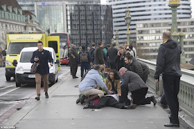 One victim of the car attack was left floating face down in the Thames but was pulled from the river alive. The bridge above was strewn with the victims of the terror hit and run. Witnesses said the aftermath was like a scene from a 'Hollywood disaster movie'.